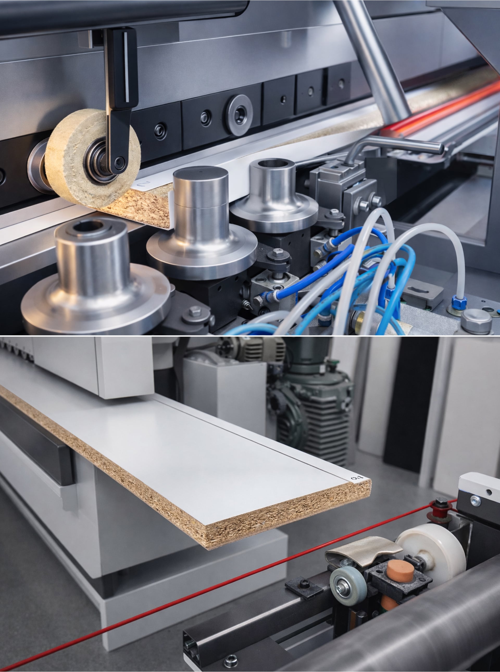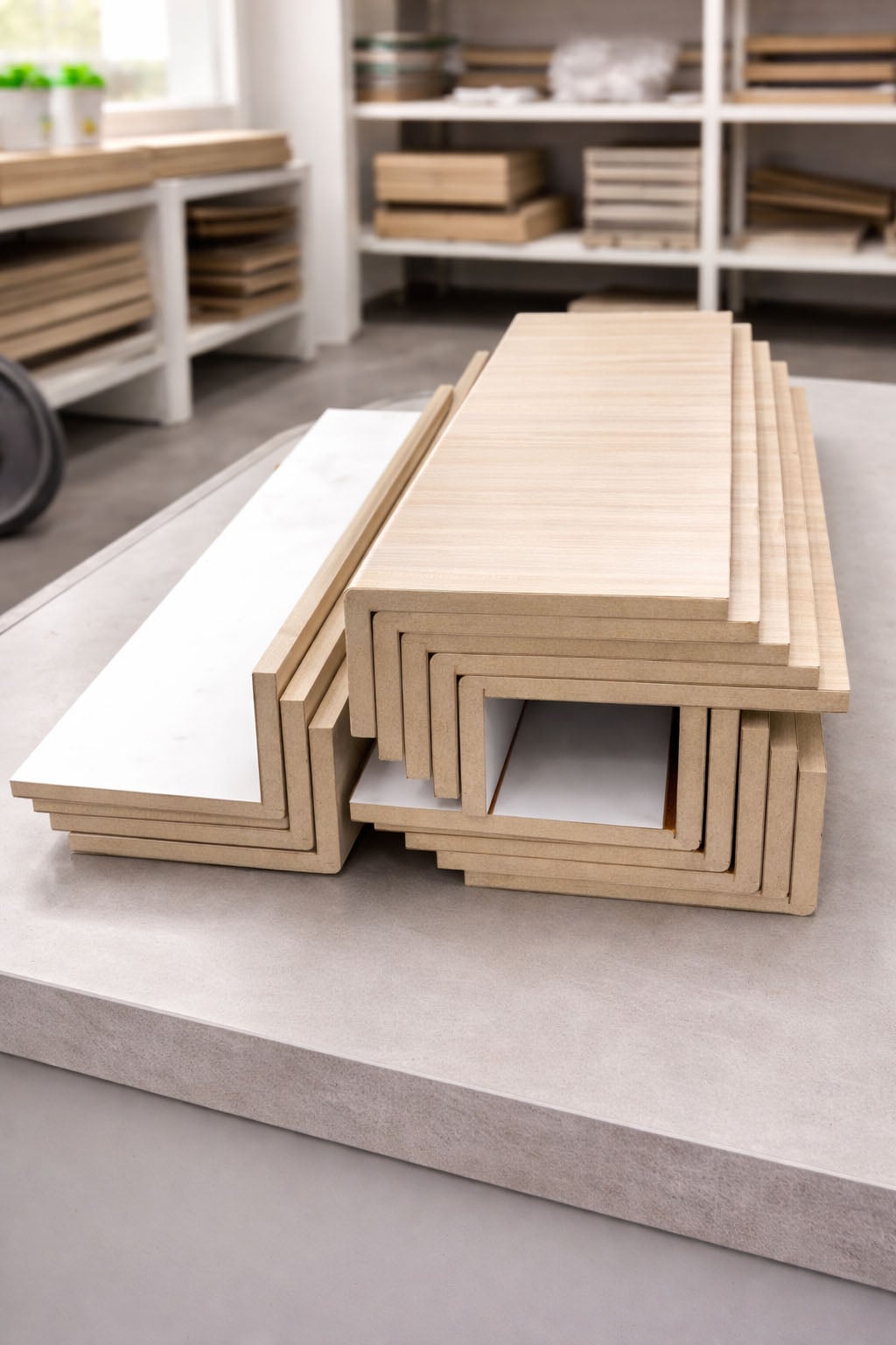 Im Technikzentrum Arnsberg fertigen wir Materialstärken von 12 bis 38 mm im modernen Formingverfahren zu fugenlosen Elementen mit Längen von bis zu 4.100 mm. Dabei wird ein hochwertiger Schichtstoff auf einen Trägerwerkstoff wie Spanplatte oder MDF aufgebracht, anschließend erhitzt und präzise umgeformt. Das Ergebnis sind nahtlose Übergänge, perfekt ausgeformte Radien und widerstandsfähige Oberflächen. Auch bei komplexeren Formen gewährleisten wir dabei eine gleichbleibend hohe Qualität und Präzision.
